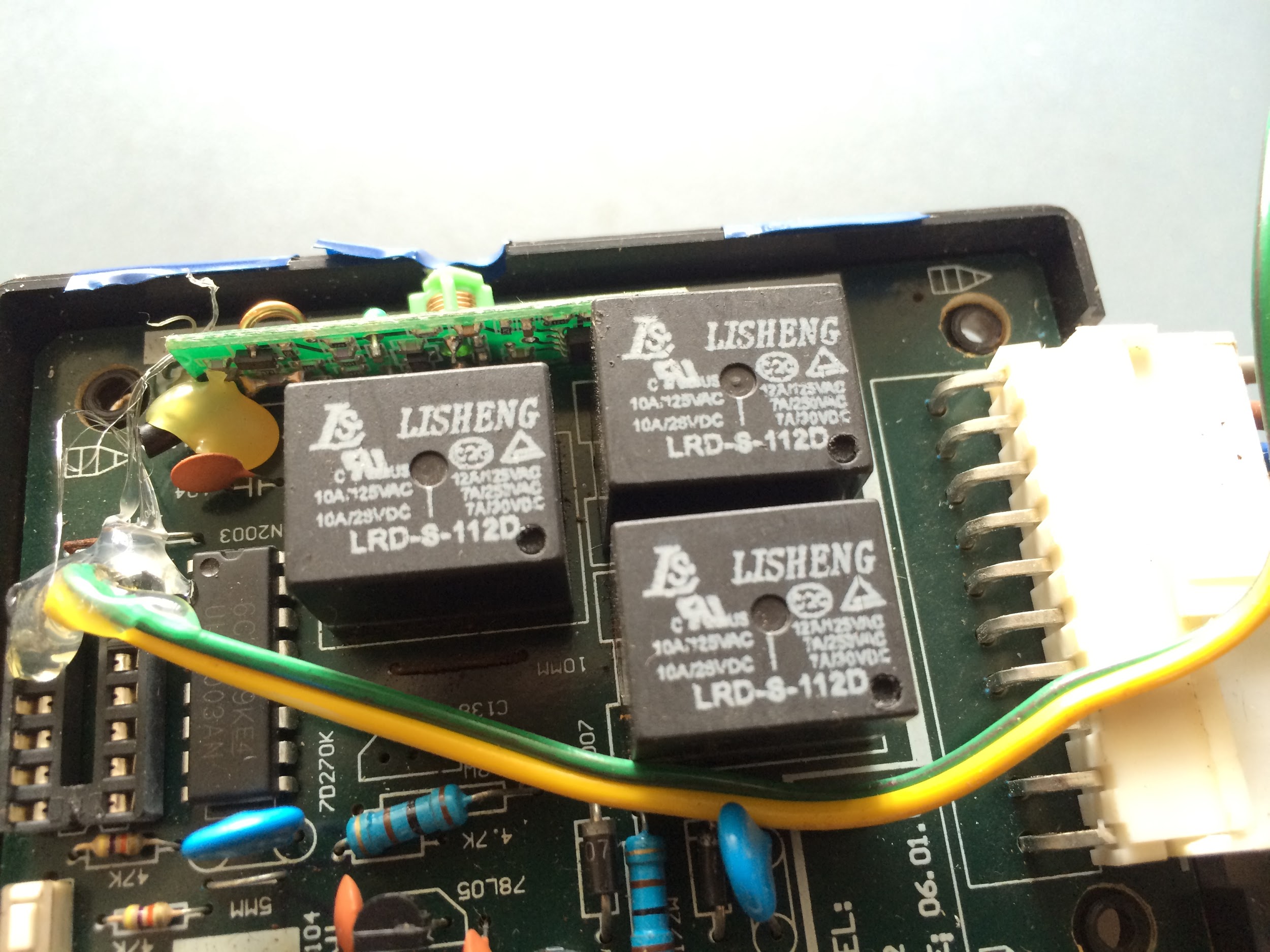 The PIC controlled the relay ,with the Darlington pair IC s as the current Driver. I removed the PIC from the IC Mount and soldered a piece of wire each from the track that controlled to both the relay and I connected the other end of the wires to a Digital pin each of the arduino. I also connected their grounds together and connected the Vin Pin of the arduino to the 12 V rail of the Controller.